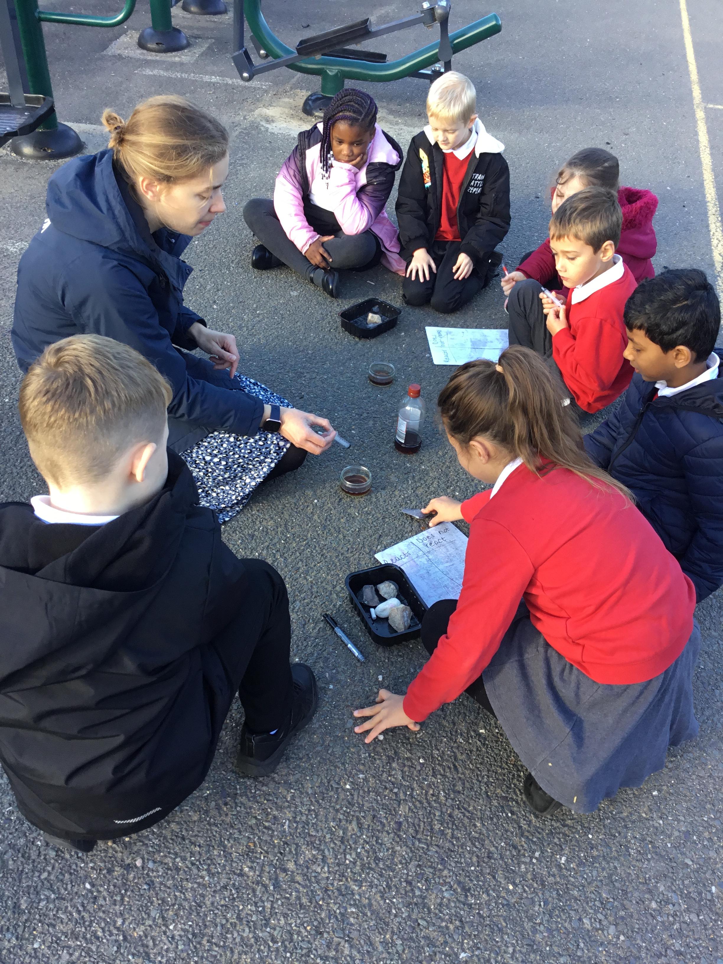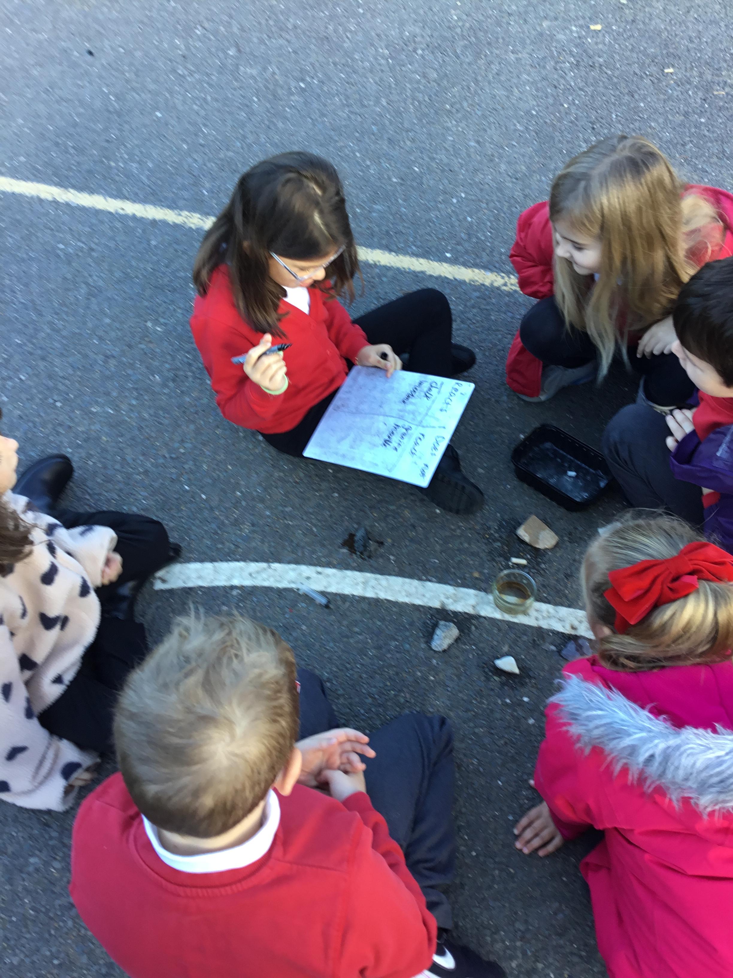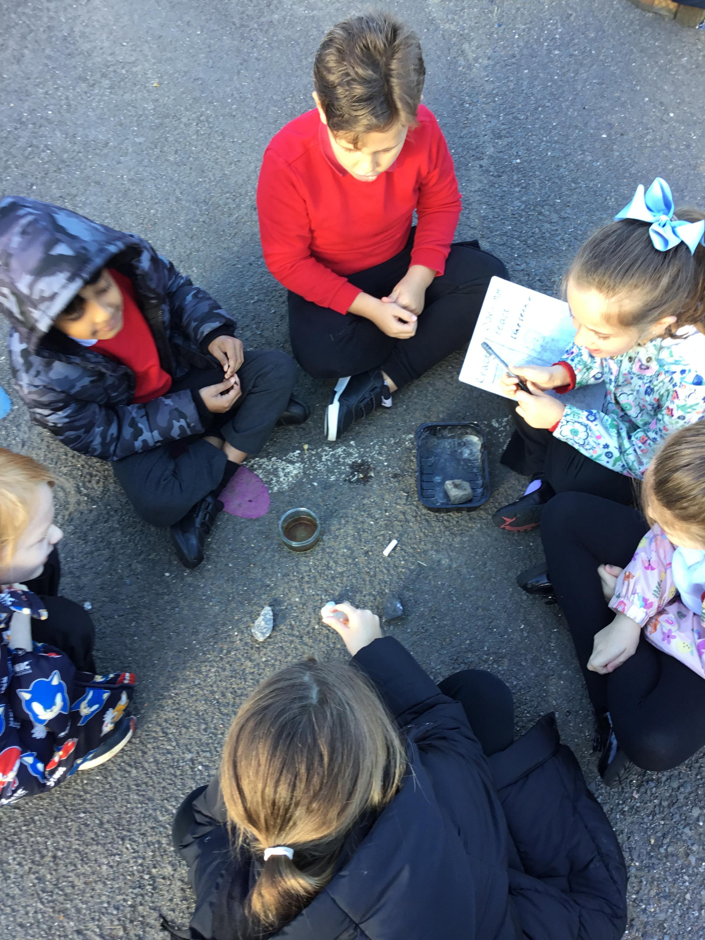 Year 3 have been learning about rocks. They tested whether they could identify a rock as limestone or chalk. Working together in small groups, they dropped vinegar onto different rocks and observed the reaction.